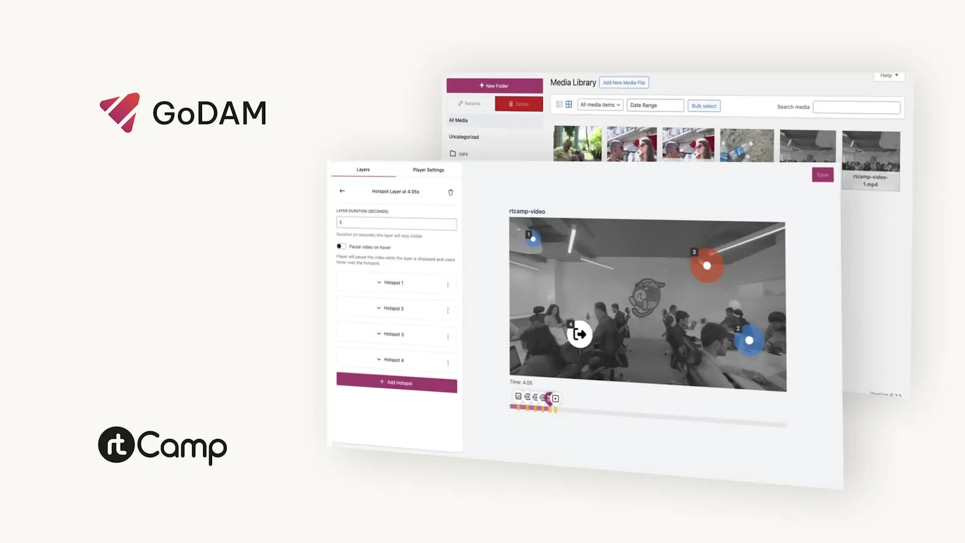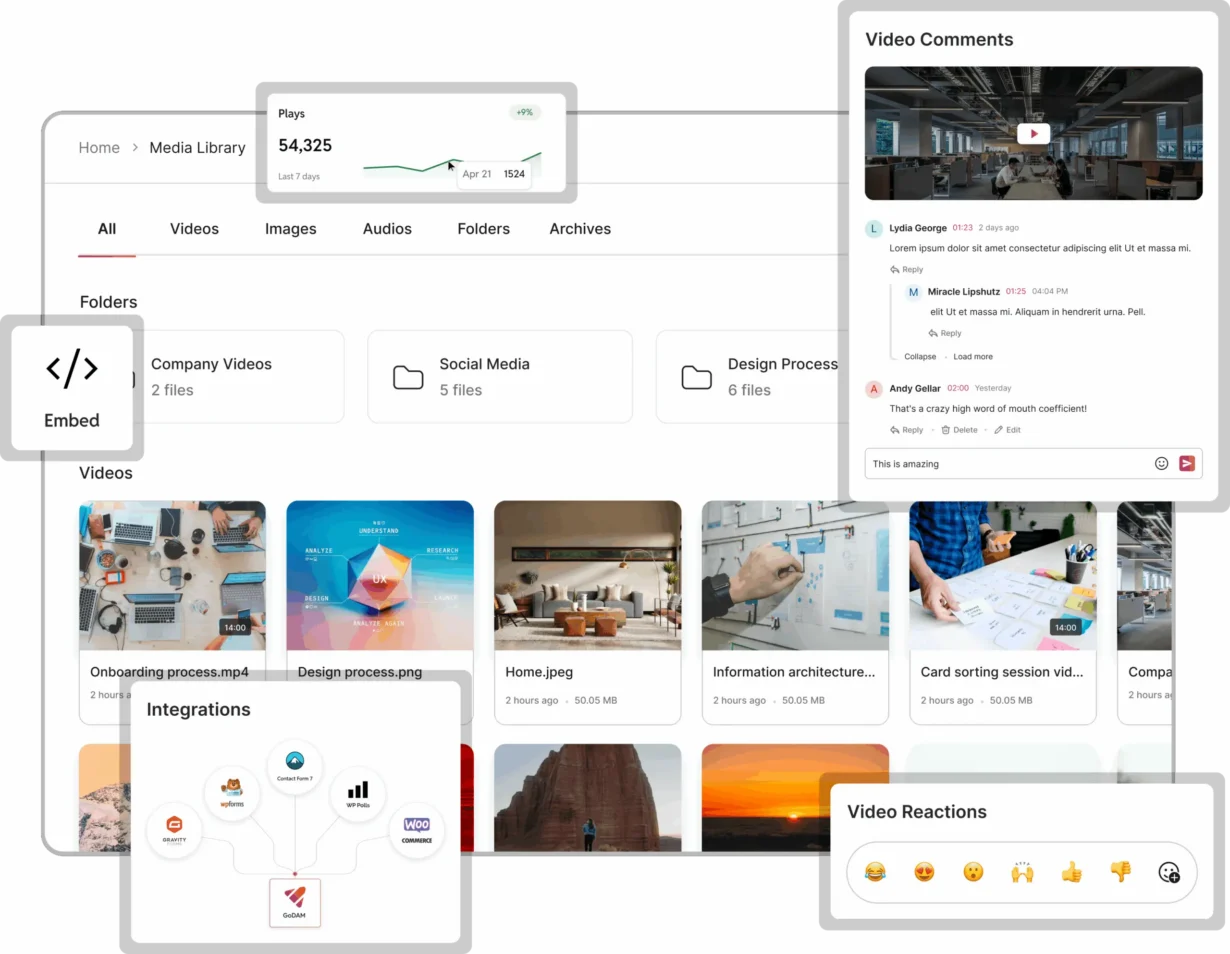 GoDAM is a media management service that seamlessly integrates with your WordPress site to optimize and enhance your audio and video content. It automatically converts uploaded audio files to MP3 and video files to MP4 formats. Additionally, GoDAM offers a suite of powerful features, including thumbnail generation, shortcode support, customizable video layers (like Gravity Forms, text/image CTAs, video hotspots, and ads), adaptive bitrate streaming for smooth playback, and advanced asset management tools.