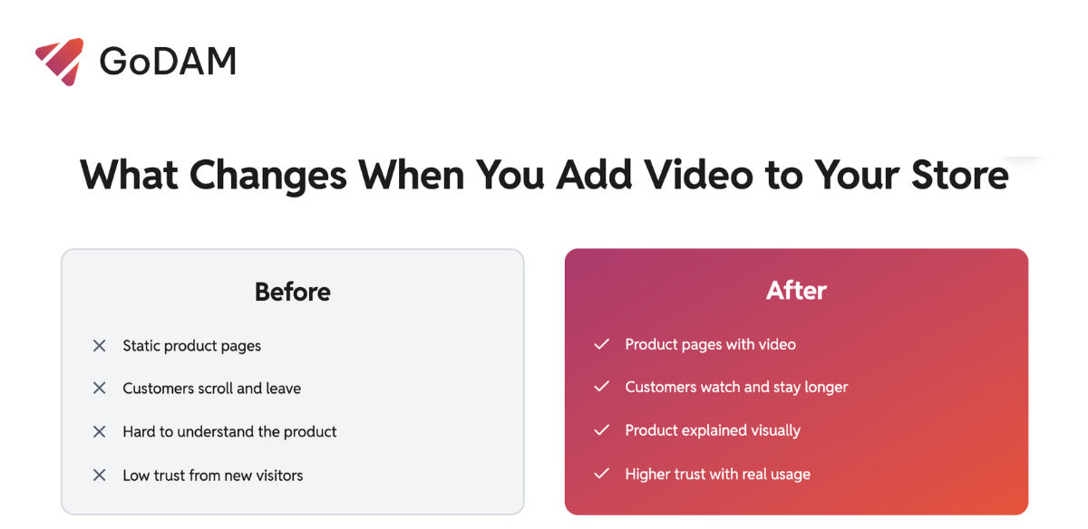 Instead of sending people back to YouTube or Instagram, you bring that same video experience onto your product page. They watch, stay in context, and can buy without leaving.